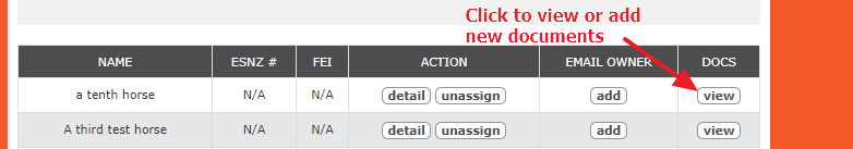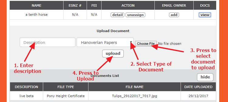 You now get a pop-up where you can upload a document that is stored against this horse for all future shows. Please follow the steps in order.