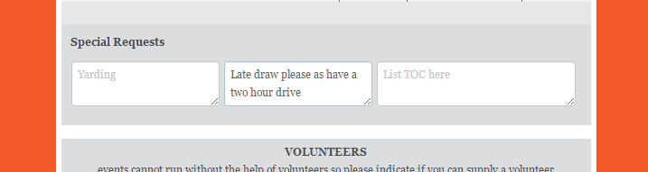 If you have any special requests or are riding a test of choice you can enter this information here.