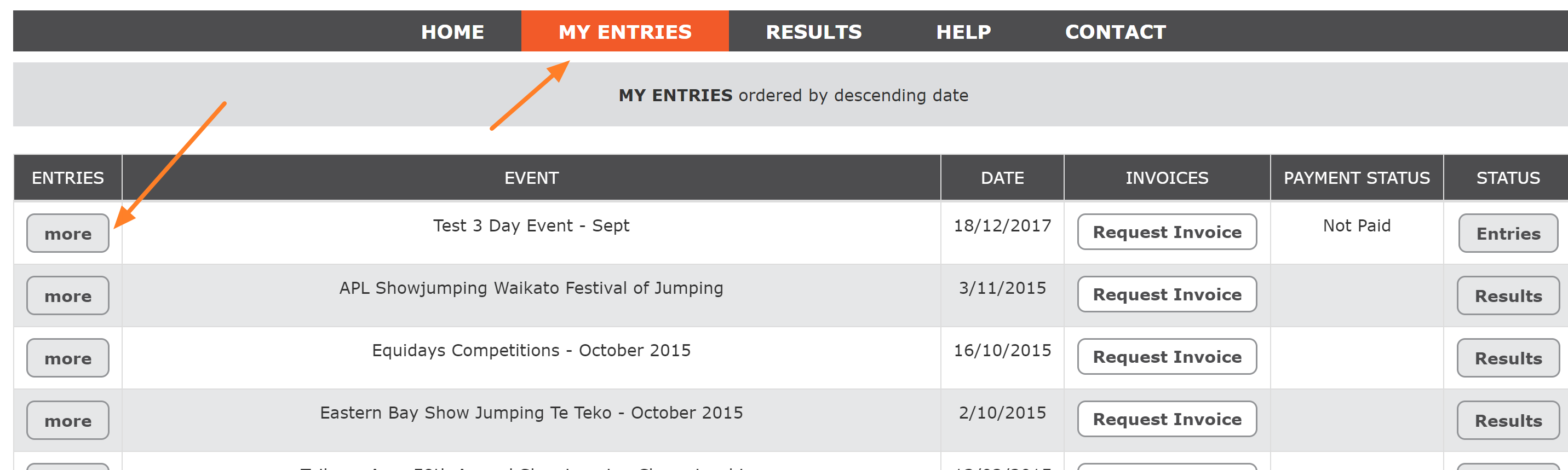 On the My Entries page you can make changes to your entry including changing the horse, changing the rider, changing the class and scratching from the event. When you make changes here, a message is sent the event secretary and they will make the changes manually so it may take some time to appear online.