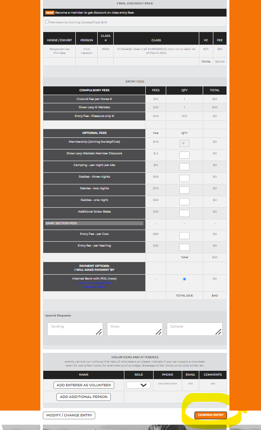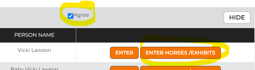 Tick the Agree box, if you don’t agree you cannot proceed. Then tick Enter Horses/Exhibits