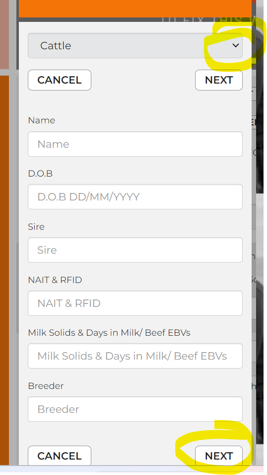 You will now get a pop up where you can select the type of animal you are wating to enter and you fill in the details and the click next