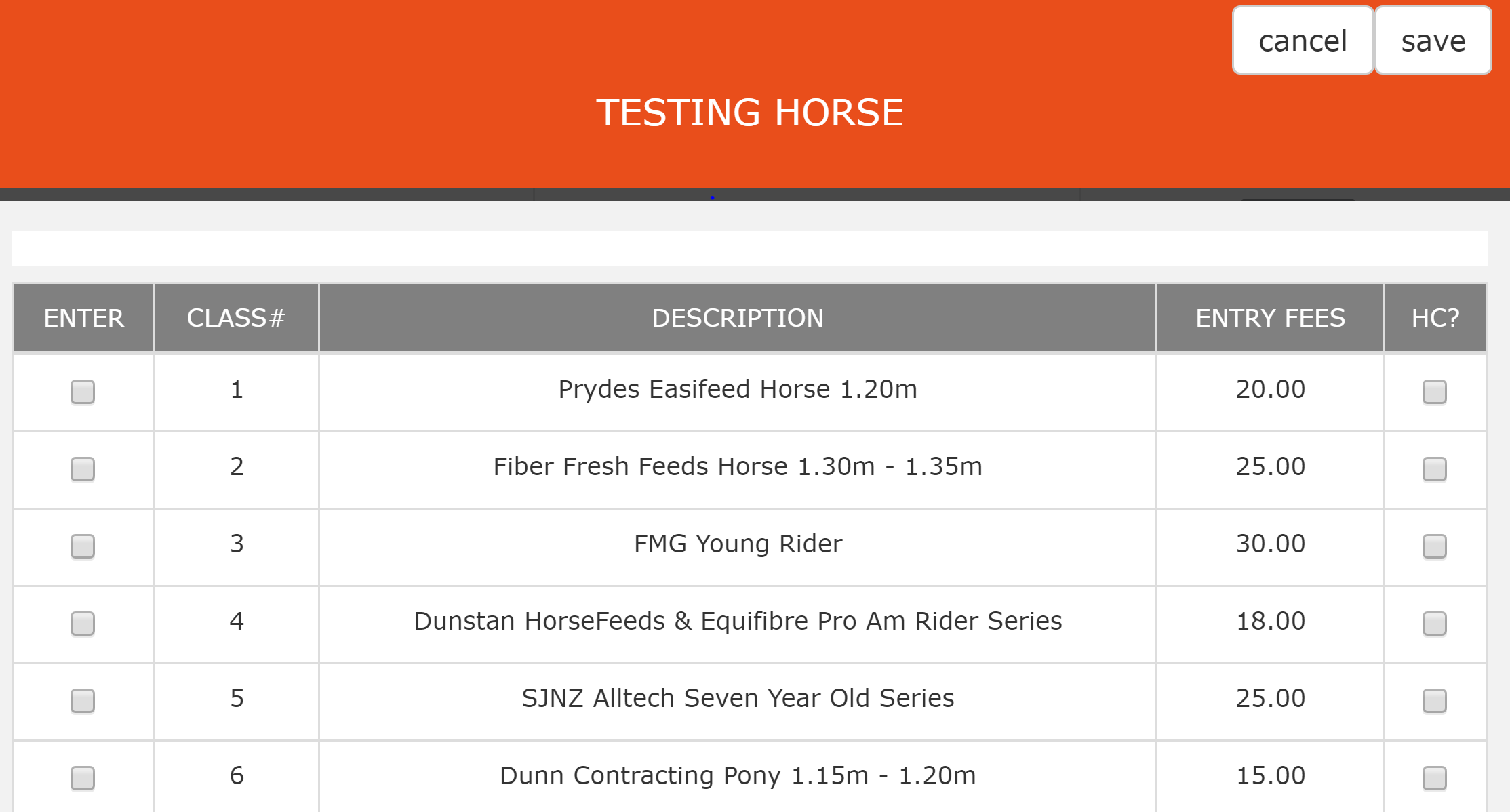 You will get a pop up with the list of classes available at the show. Tick the enter box on the left for each class you want to enter.